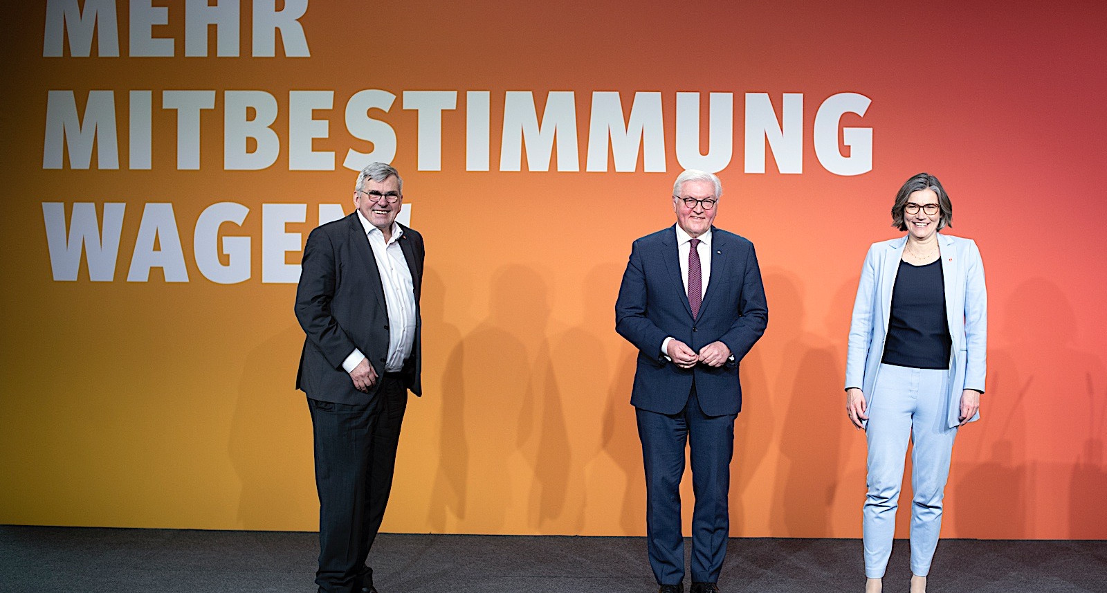 Zum Auftakt ins Betriebsratswahljahr diskutierte die IG Metall am 03. Februar in Berlin mit Betriebsräten, Politik und Wissenschaft, wie die Mitbestimmung der Beschäftigten weiterentwickelt werden muss. Unter dem Motto "Mehr Mitbestimmung wagen!" kamen Bundespräsident Frank-Walter Steinmeier, die Zweite Vorsitzende der IG Metall Christiane Benner, Klima-Aktivistin Luisa Neubauer, Prof. Dr. Lisa Herzog (Universität Groningen), der Erste Vorsitzende der IG Metall Jörg Hofmann und der Chef des Bundeskanzleramtes Wolfgang Schmidt ins Café Moskau nach Berlin. Prof. Dr. Kerstin Jürgens (Universität Kassel) war online zugeschaltet.
