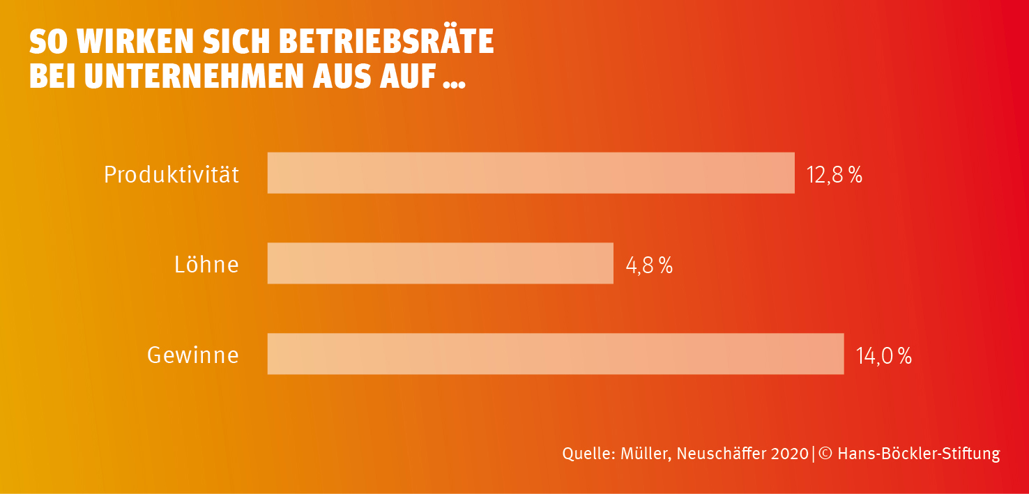 Mitbestimmte Unternehmen sind im Durchschnitt 12,8% produktiver, zahlen um 4,8% höhere Löhne und machen 14% mehr Gewinne als nicht mitbestimmte Unternehmen.